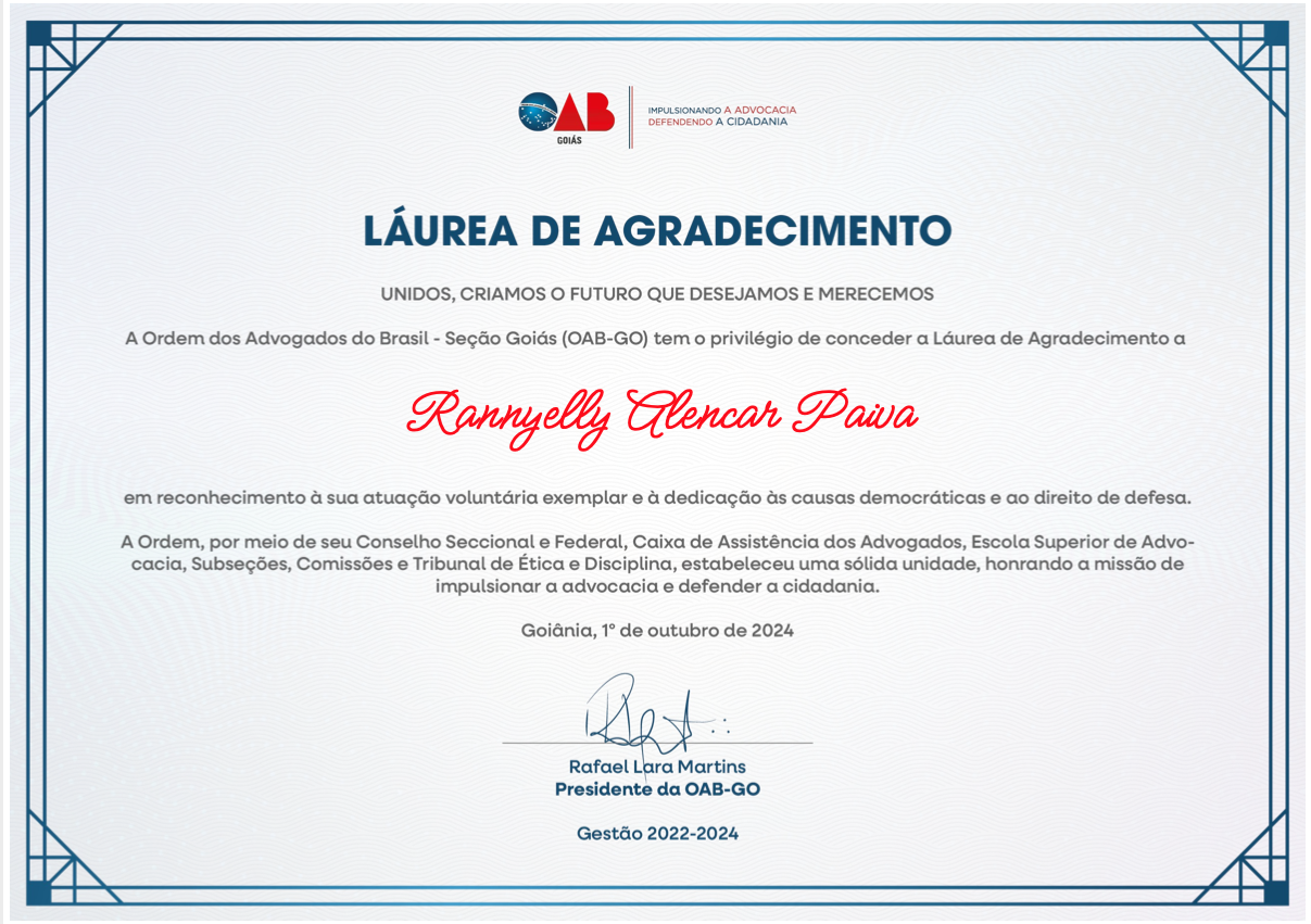 É com imenso orgulho que nosso sócio e fundador, Dr. Rannyelly Alencar Paiva foi outorgado com a Láurea de Agradecimento do Conselho Federal da OAB por meio de sua Seccional de Goiás, por sua célebre atuação e seu comprometimento com as causas democráticas e o direito de defesa, além do reconhecimento ao seu trabalho e dedicação à essa tão importante entidade, a qual tanto nos orgulhamos.